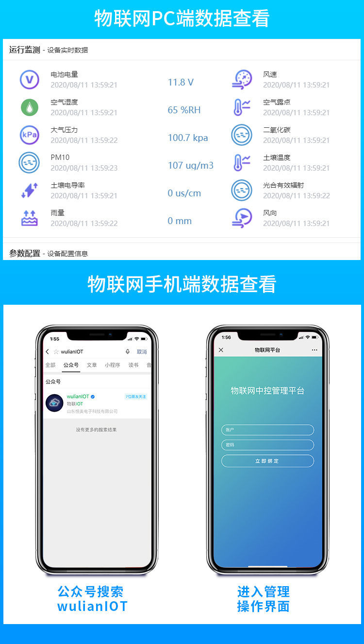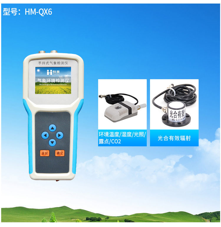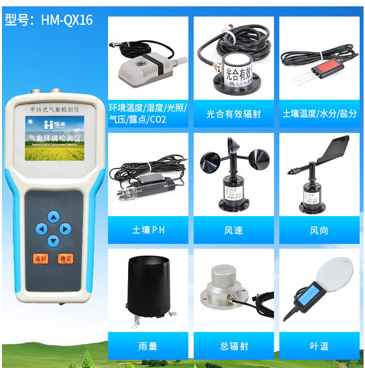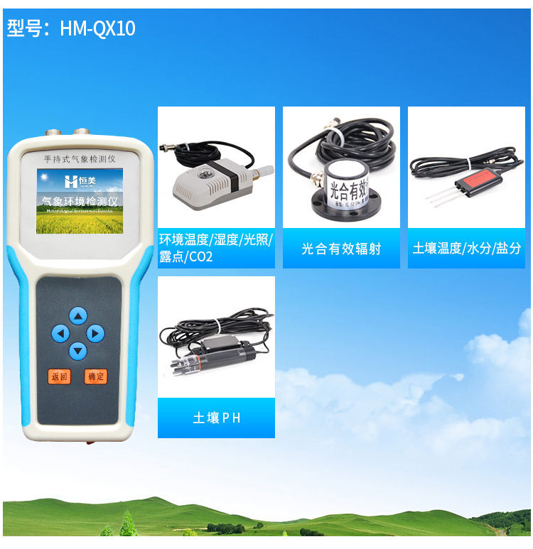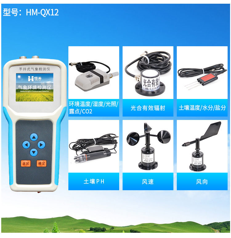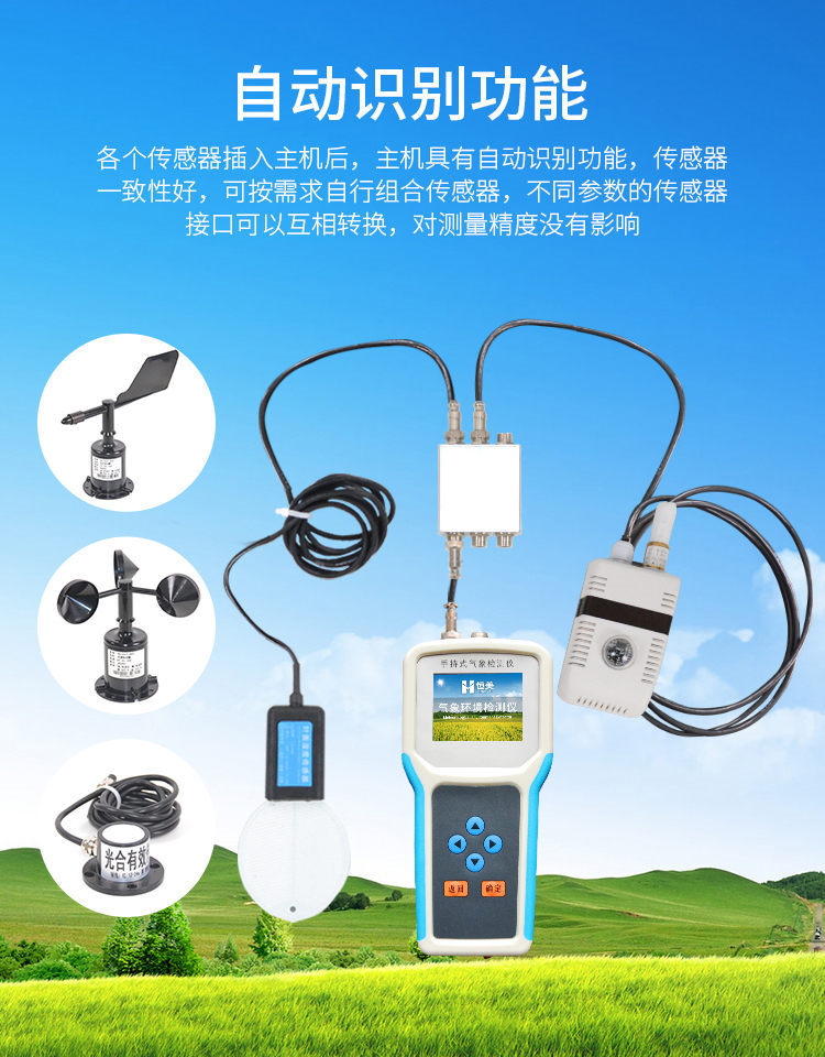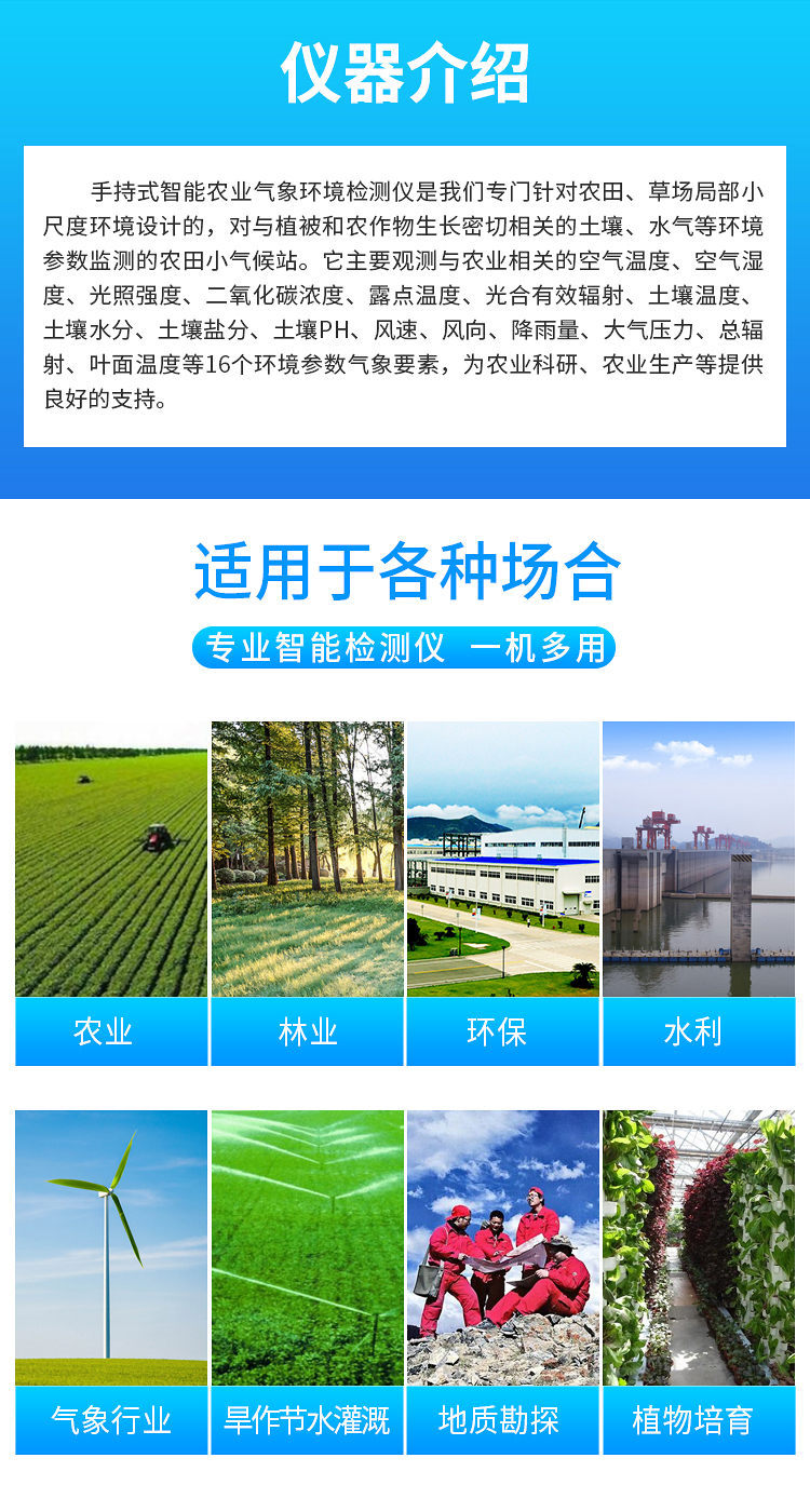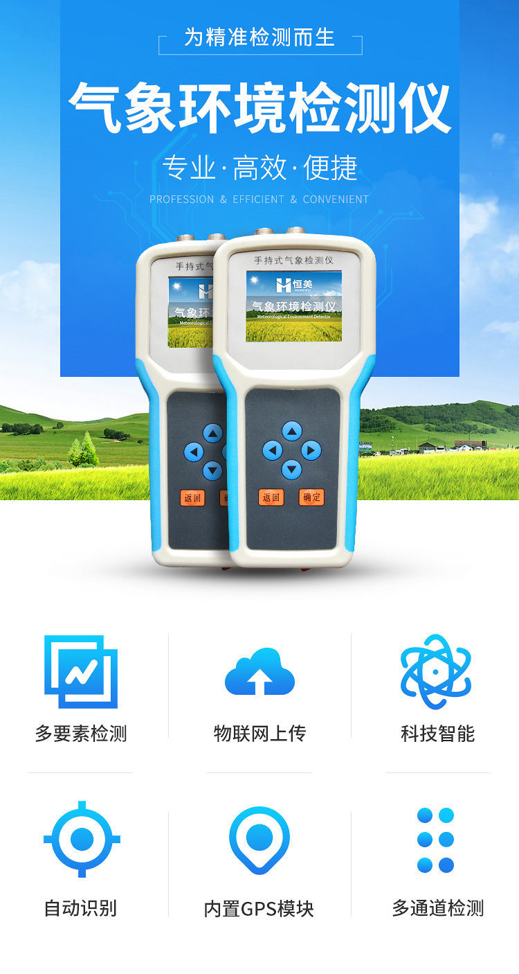 手持式智能農業氣象環境檢測儀是我們專門針對農田、草場局部小尺度環境設計的,對與植被和農作物生長密切相關的土壤、水氣等環境參數監測的農田小氣候站。它主要觀測與農業相關的空氣溫度、空氣濕度、光照強度、二氧化碳濃度、露點溫度、光合有效輻射、土壤溫度、土壤濕度等8個環境參數氣象要素,為農業科研、農業生產等提供良好的支持。