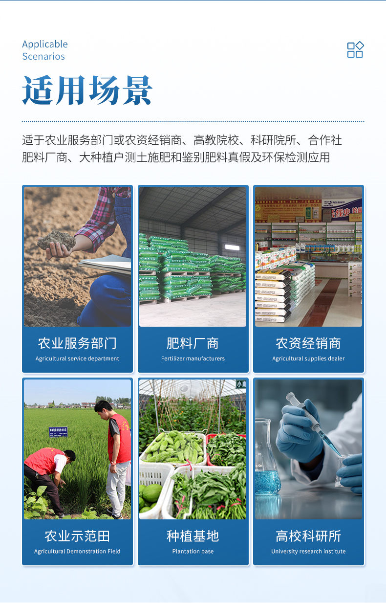 配套齊全:該儀器無需用戶自配附件,相當于一個小型實驗室。適于農業服務部門或農資經銷商、合作社、肥料廠商、大種植戶測土施肥和鑒別肥料真假。